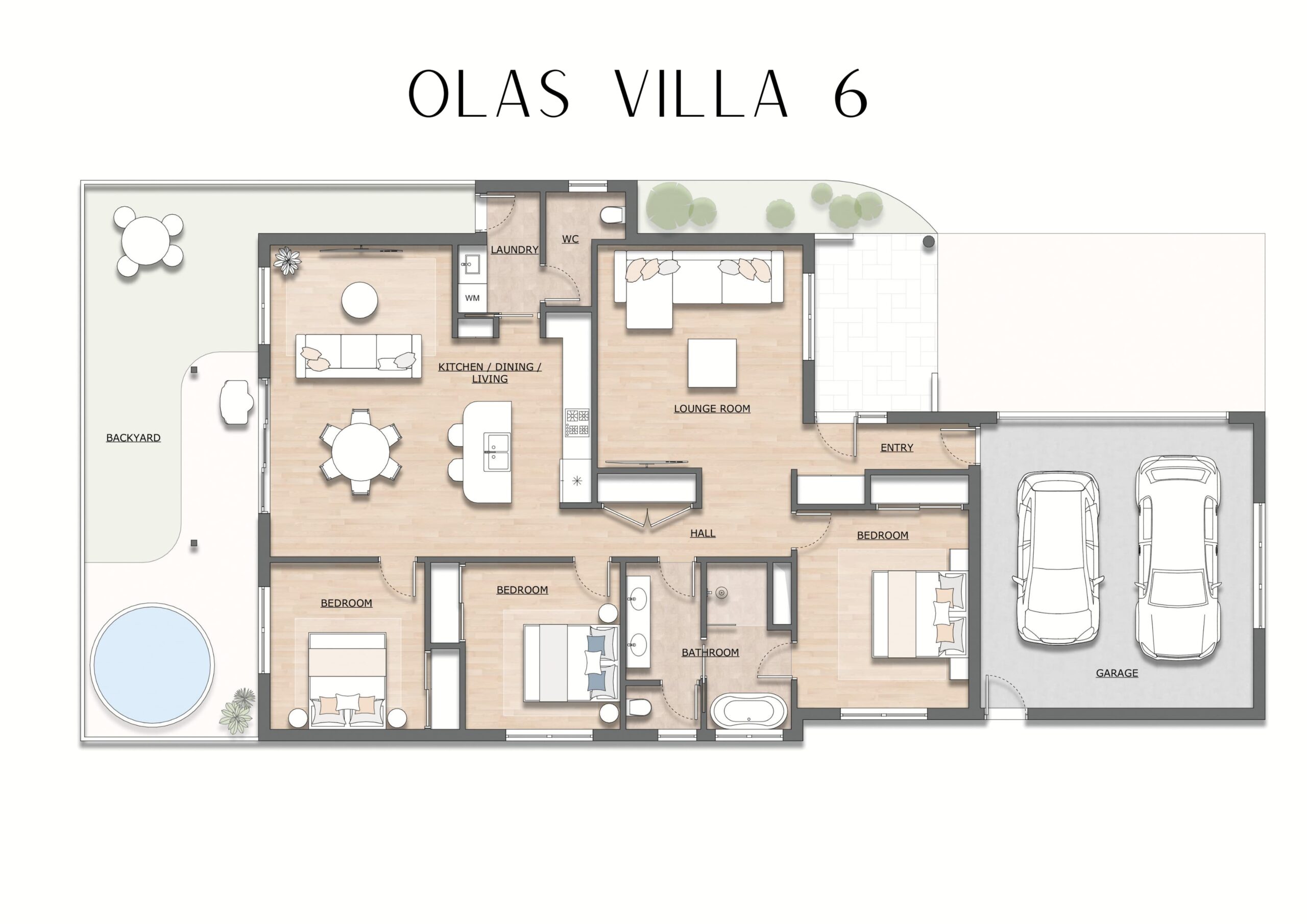 The only single-level villa at Olas, Villa 6 is perfect for families with young children or older guests who prefer everything on one level. It also features a second lounge area with its own smart TV, giving everyone room to relax. The layout makes this villa feel spacious yet homely, with easy access from the indoor living area to the pool and patio.